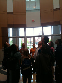 as we finished visiting the campus today in hss105, we headed from the monolithic, modern library tower to the quad, peabody park, the business building, along spring garden to the moore humanities and research administration building, concluding our brisk walk + talk at the gatewood building. students took a CLOSE look at the library tower in this next image......now THAT's encountering architecture first hand!
